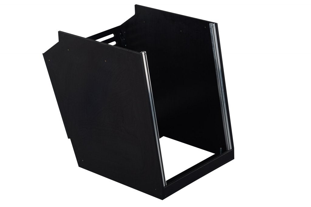 High-gloss white finish paired with matte black modules, seamlessly unified by a burnt brown leather edge for a sleek look and an ultra-comfortable workflow.
